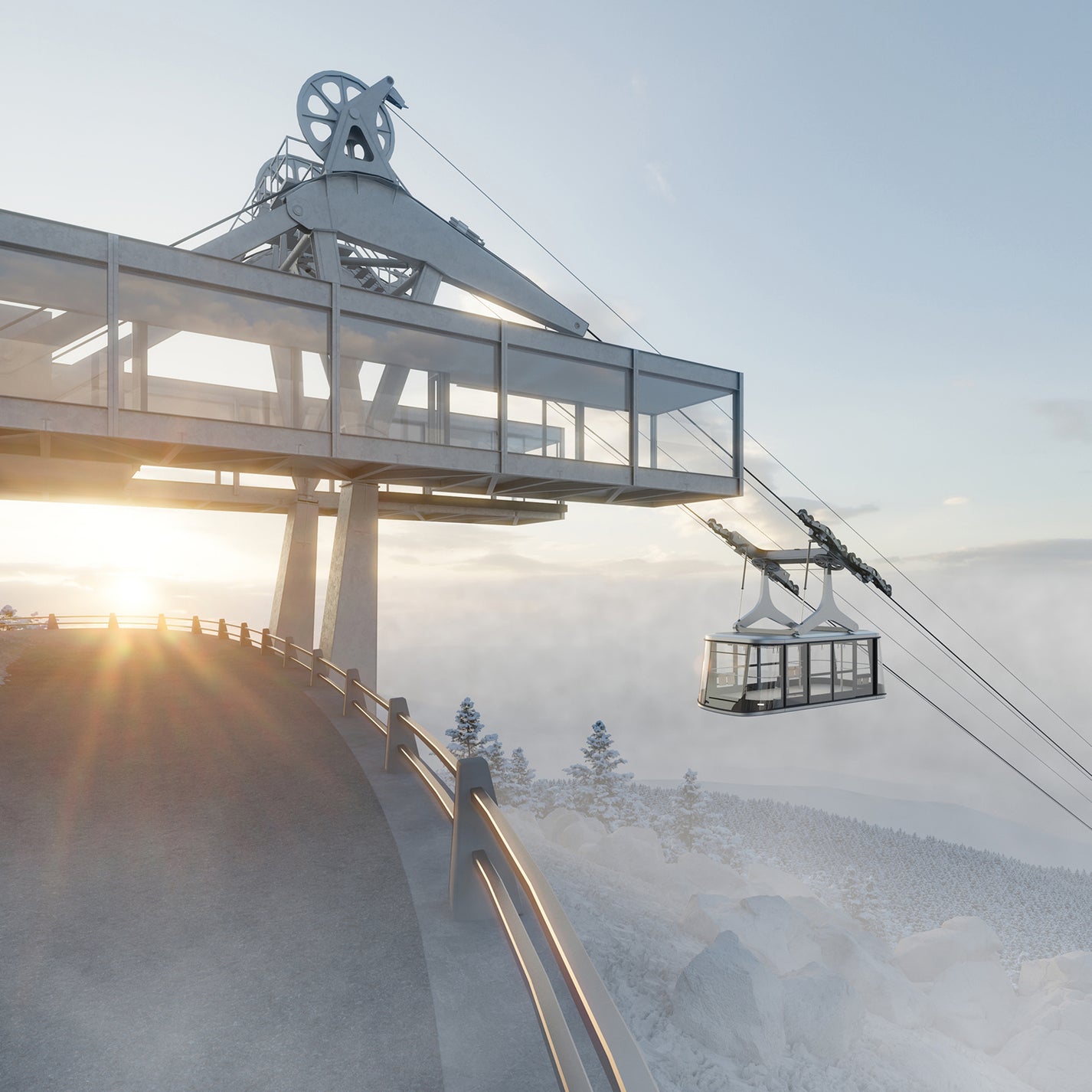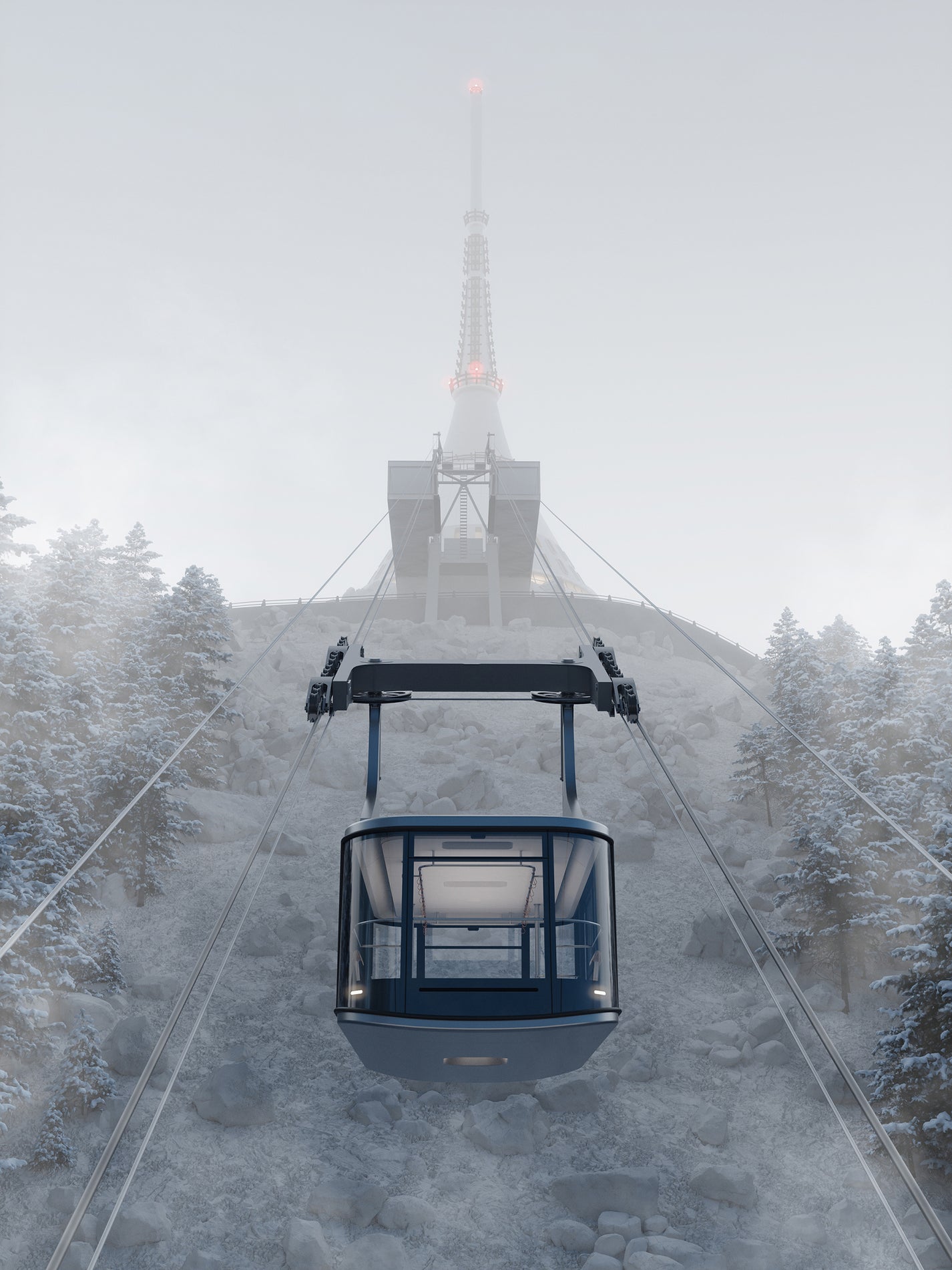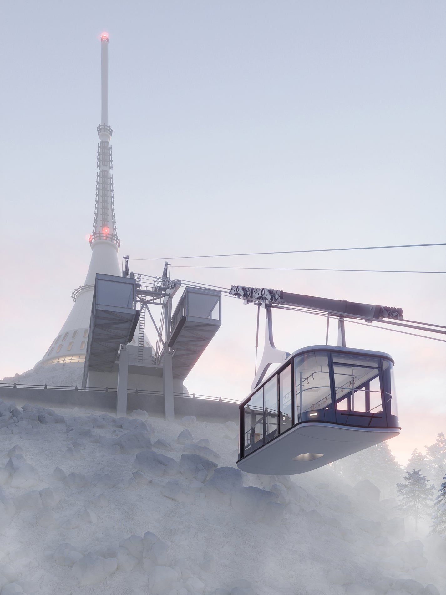 We perceive the design of the new Ještěd cable car as an exceptional and highly complex project, requiring a sensitive approach to the site, its history, and its symbolic significance. The new funicular is designed as a single large-capacity Funifor cabin, suspended on two cables so-called “ropeway tram” with a capacity of up to 100 passengers.