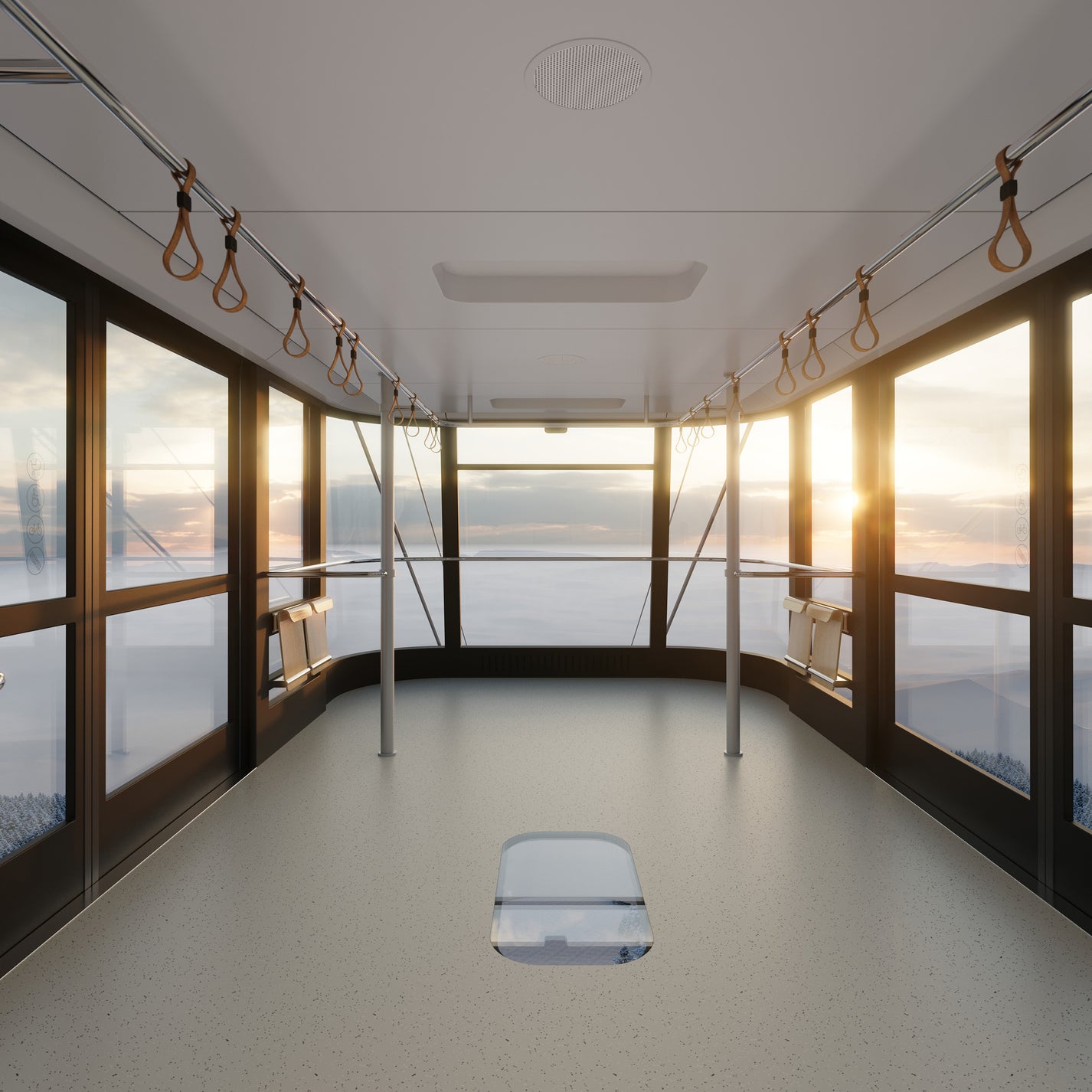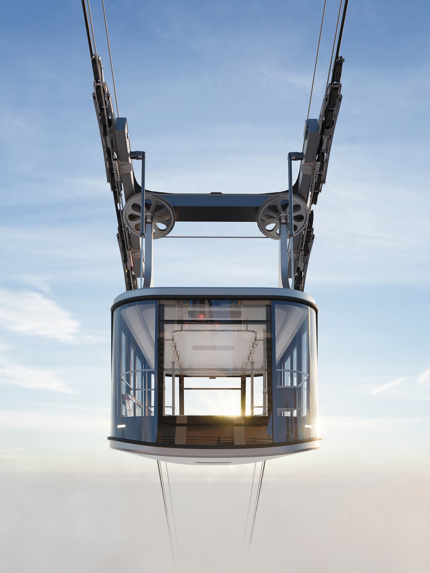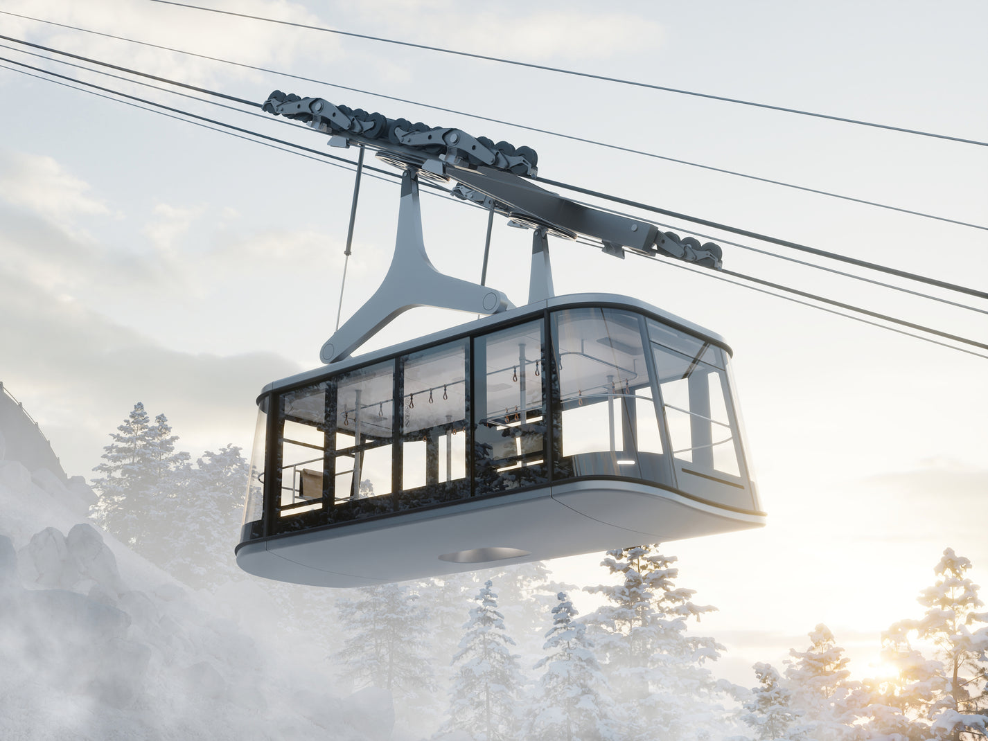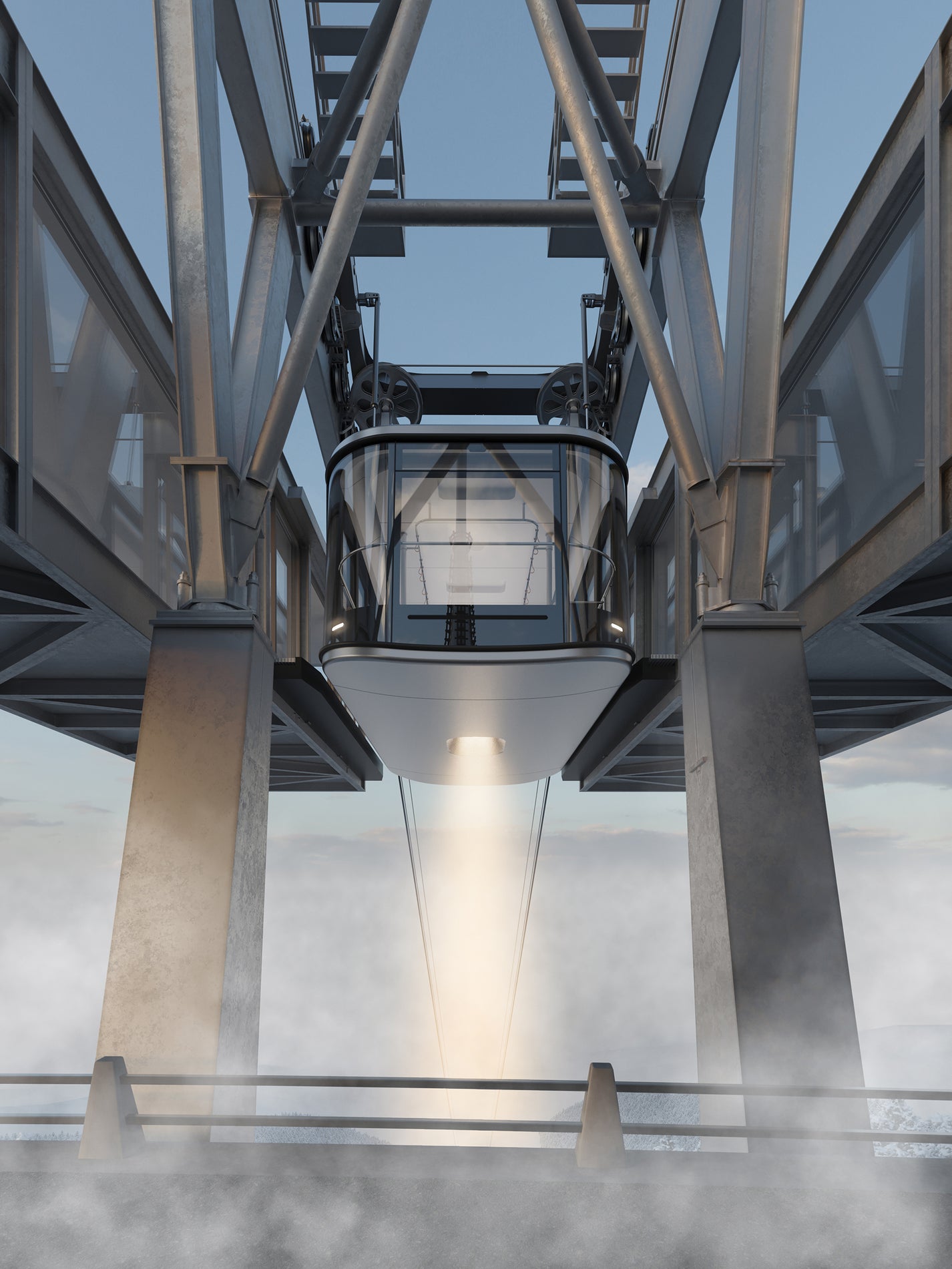 The selected single-cabin system enables efficient and clearly organized passenger boarding. The overall transport capacity will in fact be slightly higher than that of the original system. In the initial design phases, we also considered a two-cabin variant; however, thanks to its dual suspension arms and greater stability in windy conditions, the Funifor system is currently regarded as one of the safest ropeway technologies. For this reason, it ultimately proved to be the most suitable solution. At the same time, its very short suspension allows for lower pylons, resulting in a more sensitive integration into the landscape.